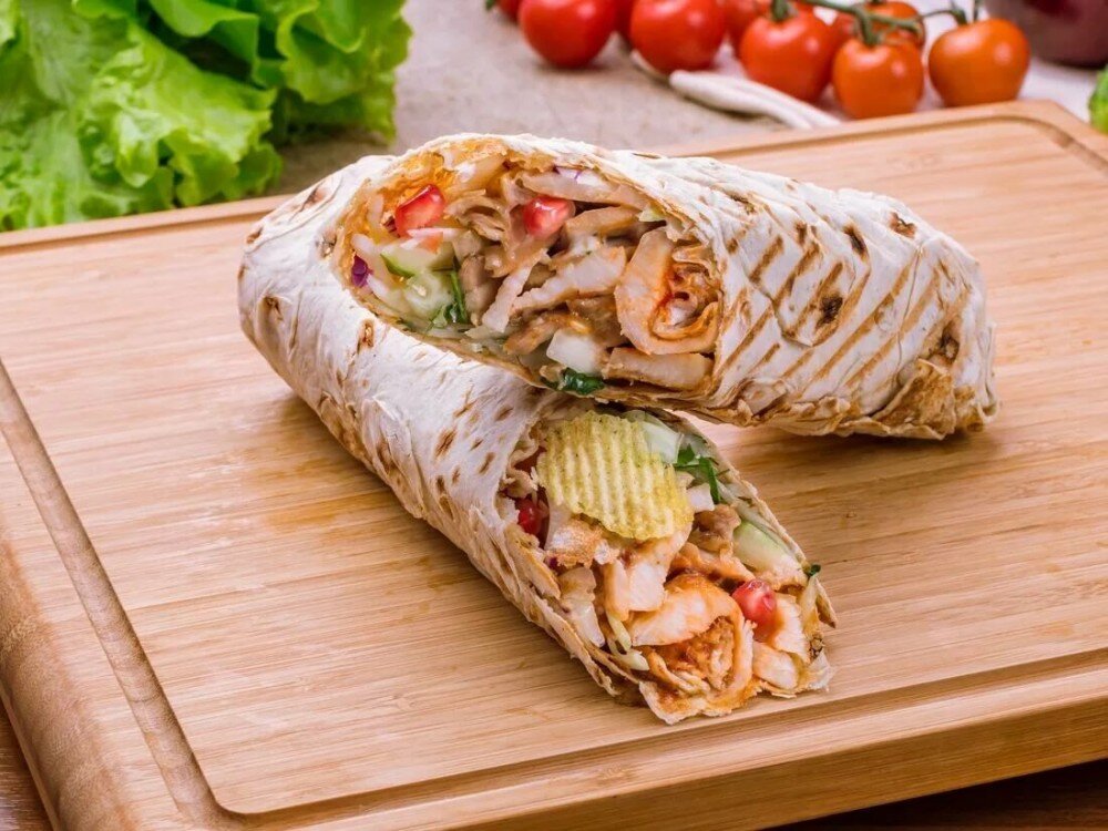 Лаваш,мясо курицы,огурцы,помидоры,картофель фри,соус